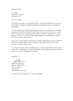 J’attends votre intervention immédiate pour cette situation de vie ou de mort. Il est inutile de dire que l’UNHCR et le gouvernement japonais seront considérés comme responsables de la vie et de la liberté de Jamal Saberi.
